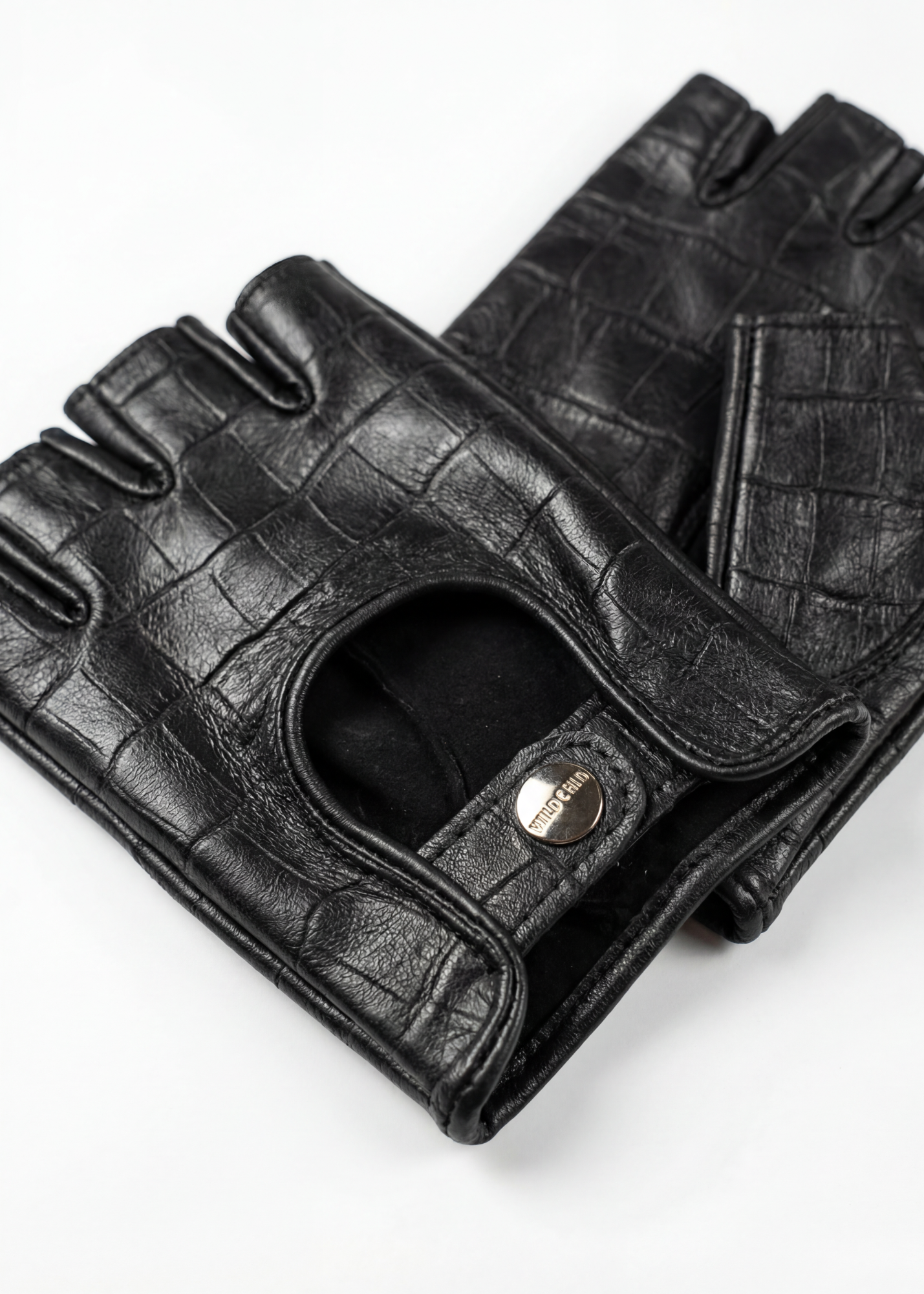 A study in attitude and refinement, the WILDCHILD Fingerless Crocodile-Embossed Leather Gloves channel the unapologetic glamour of downtown nights and runway rebellion. Cut from supple leather with a sculptural crocodile texture, they contour the hand with a second-skin fit while leaving the fingers free for movement, artistry, and edge.